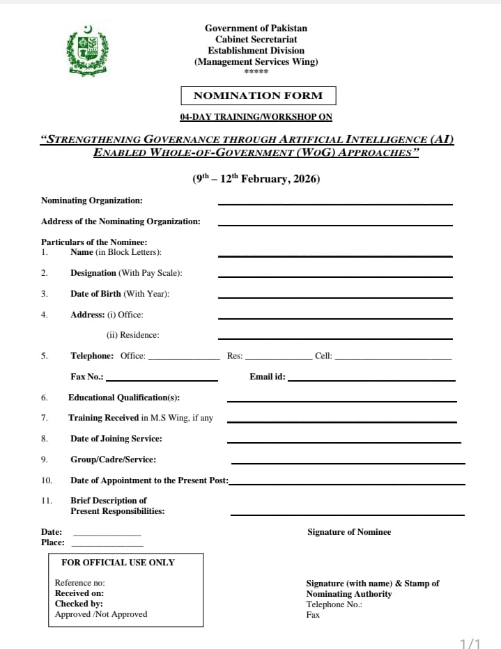 • Nomination Form for 04 Days (09 - 12 February, 2026) Training / Workshop
